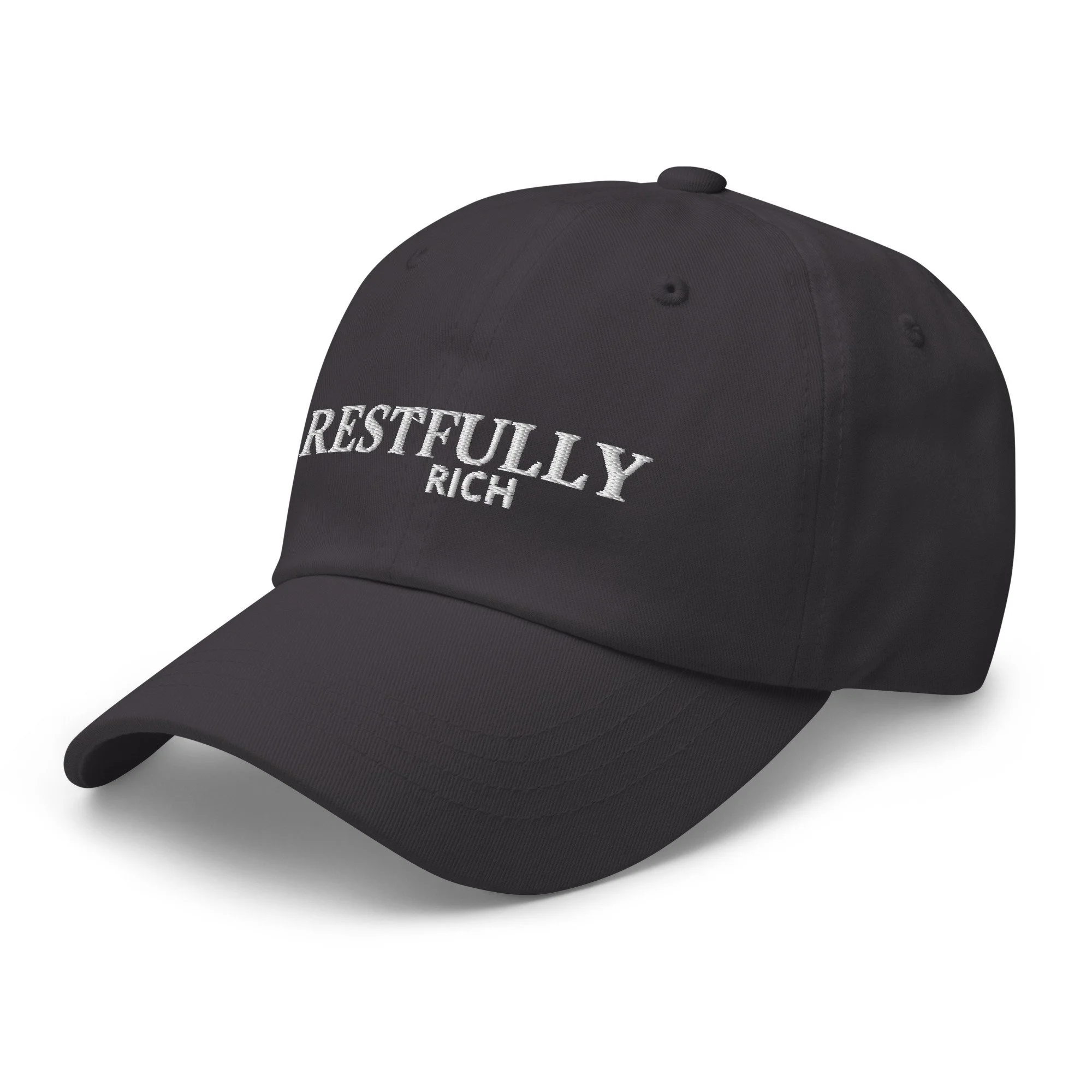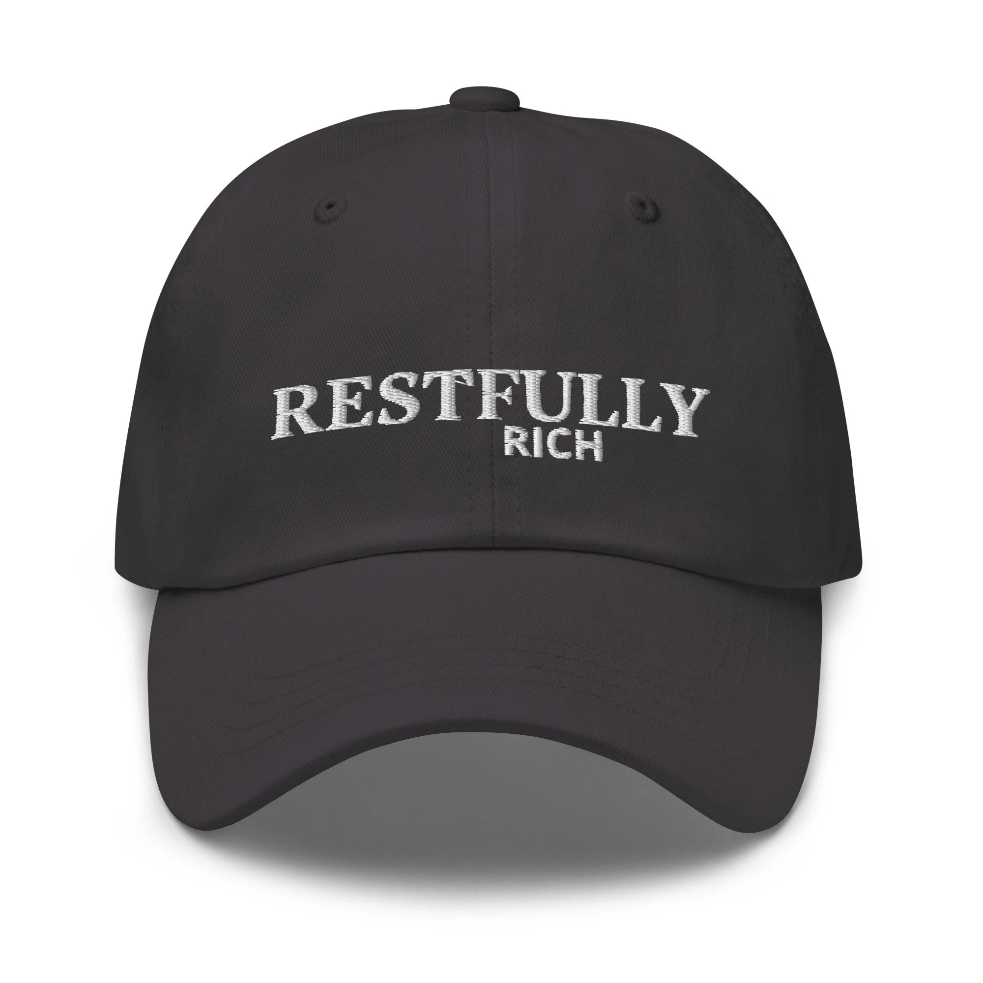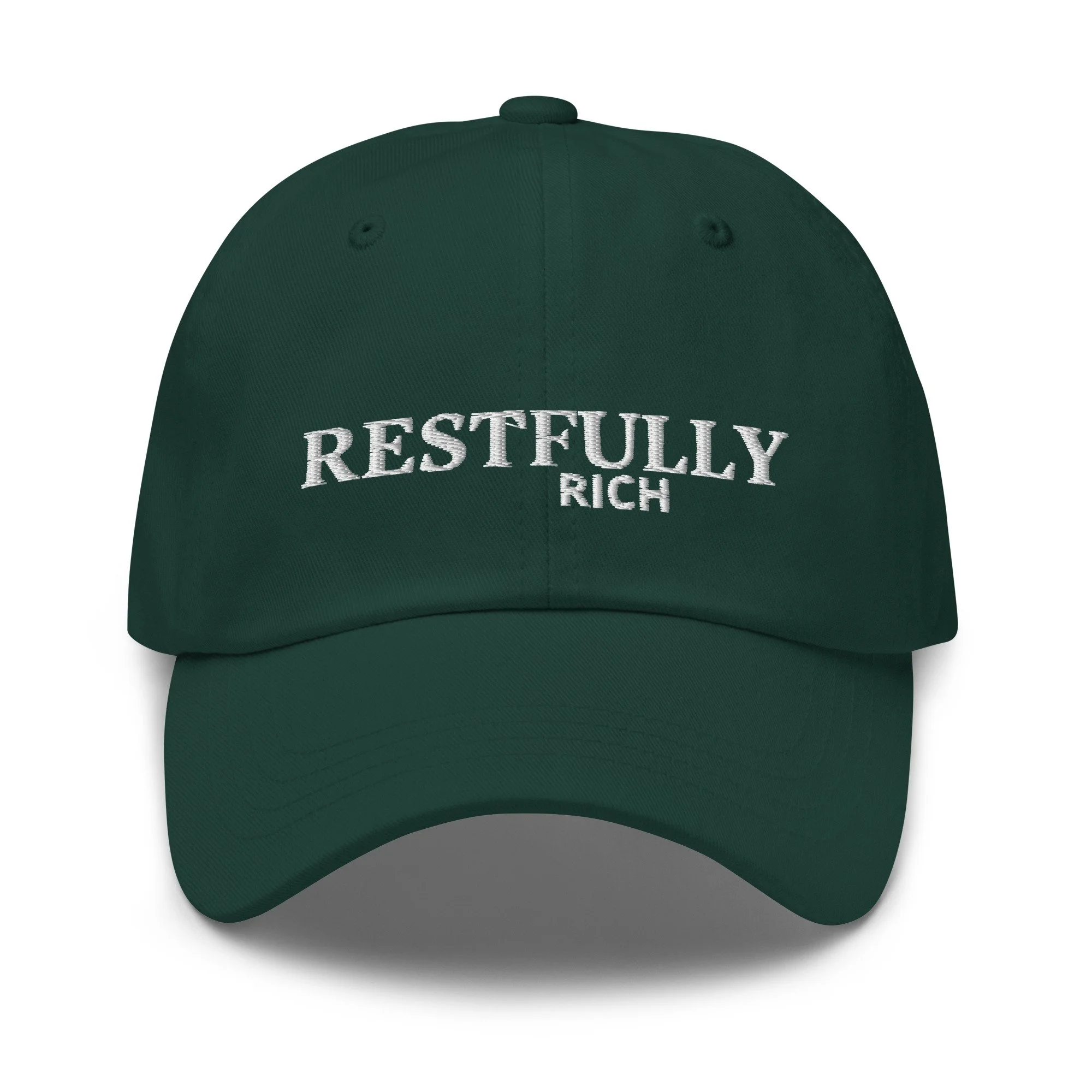 Deep emerald cap with embroidered “RESTFULLY RICH”